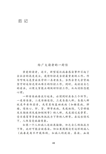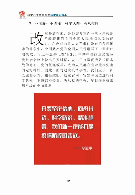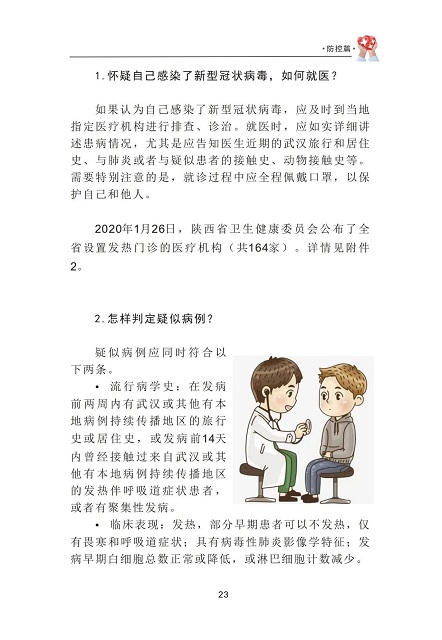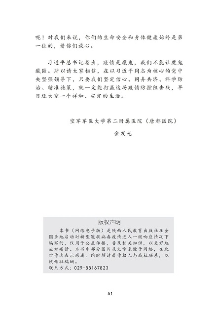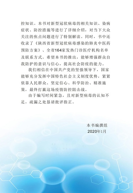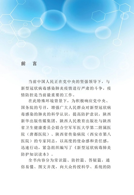 为积极响应党中央、国务院关于“把疫情防控工作作为当前最重要的工作来抓”的号召,进一步增强广大人民群众对新型冠状病毒感染的肺炎的科学认知和防护意识,陕西新华出版传媒集团、陕西人民教育出版社以高度的使命感和责任感,迅速行动、加班加点,与陕西省卫生健康委员会联合组织相关专家紧急编写、发布了《新型冠状病毒肺炎防护知识读本》(网络版),供公众免费阅读使用。